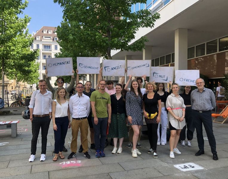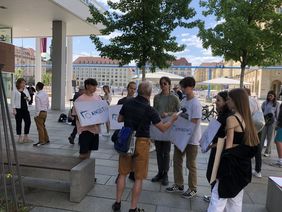 Anschließend haben die Hülßianer die Plakate mit den Schlagworten des 17. Juni präsentiert und gemeinsam mit den Schülerinnen und Schülern des Kreuzgymnasiums mit Sprühkreide Bilder und Assoziationen zum 17. Juni auf den Boden vor den Kulturpalast gesprüht.