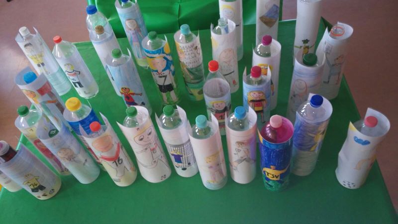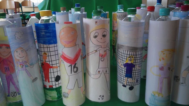 Am Mittwoch, dem 30.11. fand unser kreativer Gestaltungsnachmittag statt. Aus jeder Klasse nahmen je 4 Schüler daran teil, insgesamt 32 Schüler. Jeder malte sich selbst als Fußballspieler mit einem Trikot. Diese Bilder wurden laminiert und um große leere Plastikflaschen geklebt. Diese werden später noch mit Sand gefüllt. Wir haben die Idee, mit den fertigen Flaschen ein Wurf- oder Kegelspiel für die Hofpause anzubieten. Es hat allen Kindern großen Spaß gemacht.