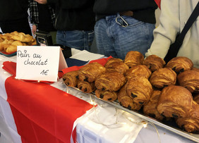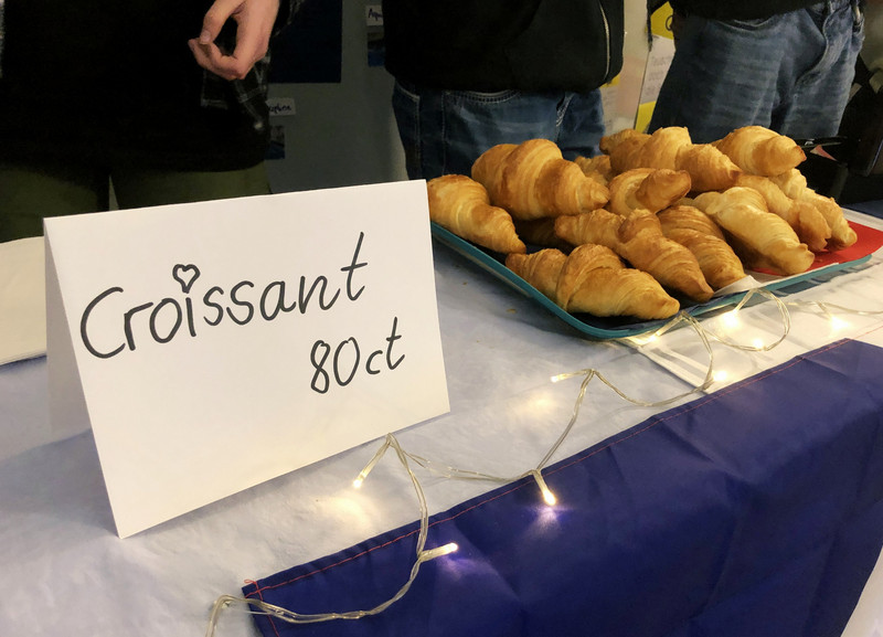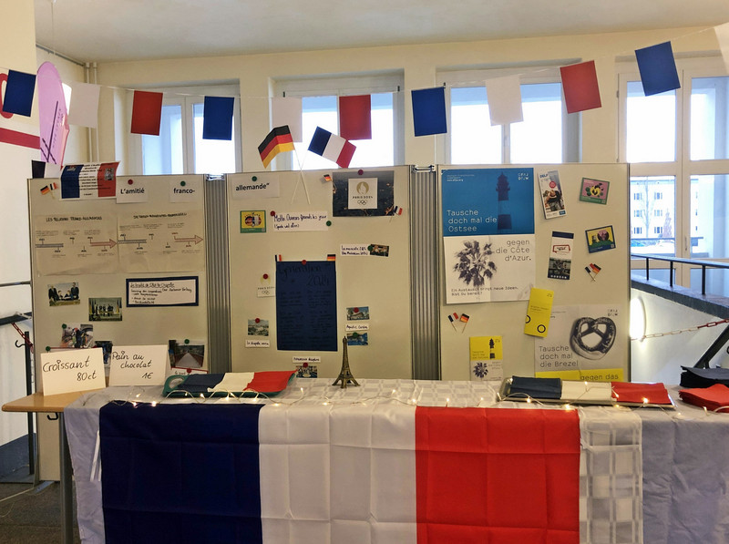 Zur Feier des Tages gab es Croissants und Pain au chocolat, es wurde französische Musik über das Schulradio gespielt und eine große Infotafel zu den deutsch-französischen Beziehungen wurde aufgestellt.