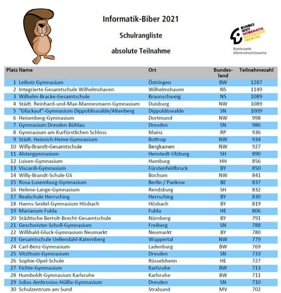 Auch in diesem Schuljahr hat das Julius-Ambrosius-Hülße-Gymnasium in Dresden mit einer Teilnahmezahl von 710 einen vorderen Platz im absoluten Schulen-Ranking des Informatik-Bibers 2021 belegt hat. Herzlichen Glückwunsch! Das herausragende Engagement Ihrer Schule wird mit einem Preisgeld in Höhe von 100 € gewürdigt.