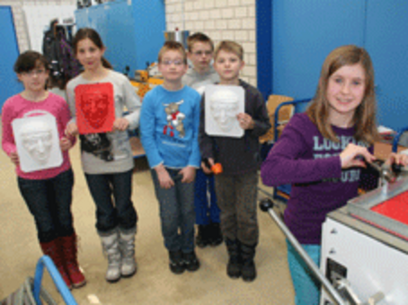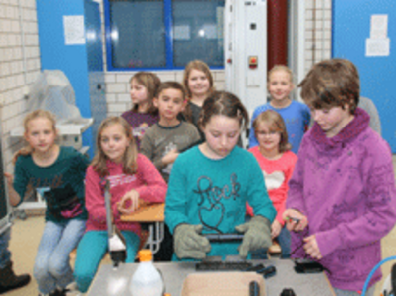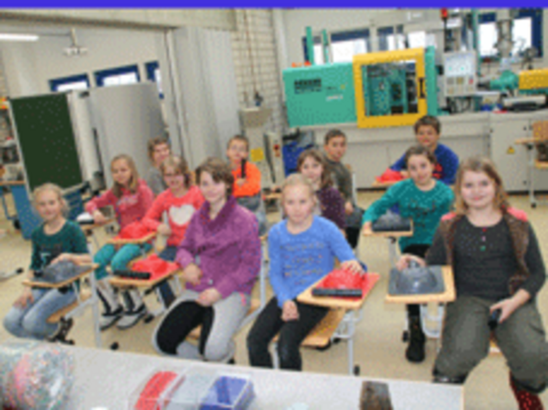 Am 31.1.2014 besuchte die 4. Klasse der Grundschule Hermsdorf im Rahmen des Werkunterrichtes den Bereich Kunststofftechnik am Beruflichen Schulzentrum Radeberg. Herr Steglich vermittelte den Schülerinnen und Schülern anschaulich Informationen zum Kunststoffkreislauf. Vom Kunststoffgranulat über die Fertigung von Formteilen bis zur Wiederverwertung wurden so praxisverbunden Kenntnisse aus dem Werkunterricht erweitert und vertieft. So stellten die Schülerinnen und Schüler eine einfache Rohrschweißverbindung her und bedienten nach Einweisung eine Umformmaschine zur Herstellung einer Maske. Die Zeit für diese Veranstaltung war leider zu kurz bemessen, so dass noch viele interessante Details des Werkstoffes "Kunststoff" nicht angesprochen werden konnten.
