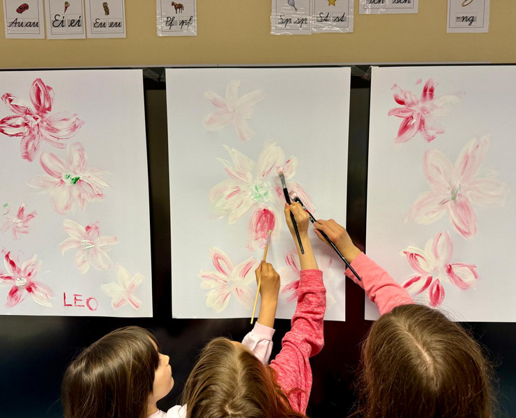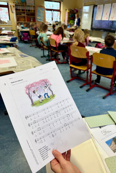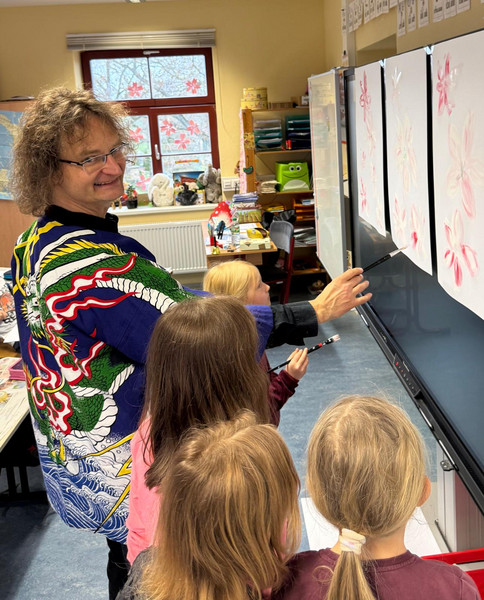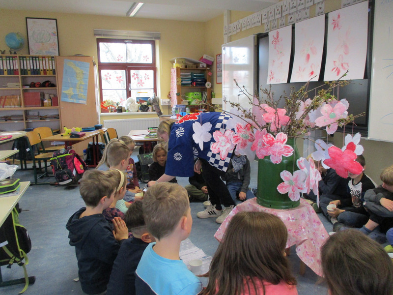 Mehrere Thementage befasste sich die Klasse 2b dieses Jahr mit der Kirschblüte Japans. Die Kinder lernten alles zur Entwicklung der Kirschblüte (Sakura) zur Frucht, dem Aussehen und der Besonderheit des Festes Hanami in Japan. Wir studierten dazu auch das traditionelle Sakura-Lied auf Japanisch ein. An einem weiteren Tag backten die Kinder mit großer Unterstützung von Frau Haubold Kirschblütenkekse in Großproduktion. Insgesamt kamen 300 Kekse zusammen, die dann sorgfältig eingepackt und mit Kirschblüten bemalt wurden. Die einzelnen Tütchen waren das Geschenk an alle Kinder der Arita-Grundschule Meißen, an der wir zum Kirschblütenfest eingeladen waren. Darauffolgend besuchte uns wieder ein besonderer Gast. Der Künstler Kay "Leo" Leonhardt brachte uns eine Technik des Malens mit Acrylfarben bei, die die Kirschblüten aus der Ferne so wirken lassen wie einen echten Kirschblütenbaum. Unter unseren Kirschblüten feierten wir Hanami, tranken Grüntee und sangen das Kirschblüten-Lied. Die Kinder überraschten Leo auch mit eigenen Bildern. Zum Abschluss und Höhepunkt der Japan-Tage fuhren wir am 16.4. zur Arita-Grundschule nach Meißen. Gemeinsam mit der ganzen Schule feierten wir Hanami im Park, bestaunten die Kirschbäume, sangen, spielten, rästelten, schlemmten Kirschkuchen, Kirschmuffins und übergaben allen Kindern die Kirschblütenkekse.