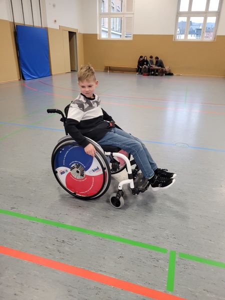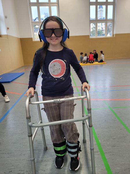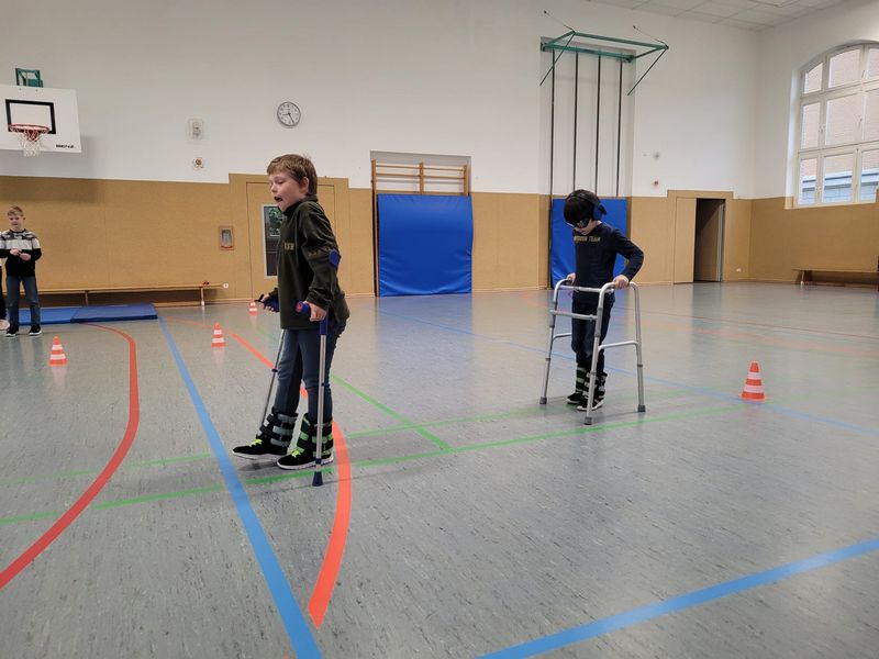 So berichtete Frau Renate Müller den Kindern von ihrem Leben als Blinde. An einer Schreibmaschine für Punktschrift (Blindenschrift) konnte jedes Kind seinen Namen in Blindenschrift schreiben. Frau Diane Kurzweg erklärte den Kindern Hörgeräte und verschiedene Sehbeeinträchtigungen durch Ausprobieren unterschiedlicher Brillen. Es lernten alle die Gebärdensprache und das Finger-Alphabet kennen. Mit Frau Sindy Seidel spürten die Kinder nach, wie sich das Leben als alter oder auch gehbehinderter Mensch anfühlt. Mit Knöchelmanschetten mit 3 Kilo Zusatzgewicht konnten die Schüler ausprobieren, dass das Laufen mit Gehbank und Krücken viel Kraft verlangt. Wie schwierig es sein kann, mit einem Rollstuhl zu fahren und dabei alltägliche Hindernisse wie Bordsteinkanten zu bewältigen, konnten die Kinder ebenfalls ausprobieren.