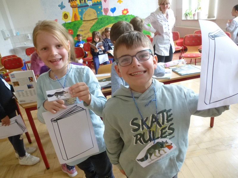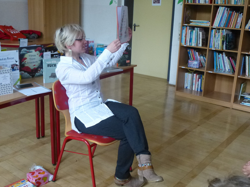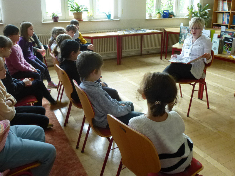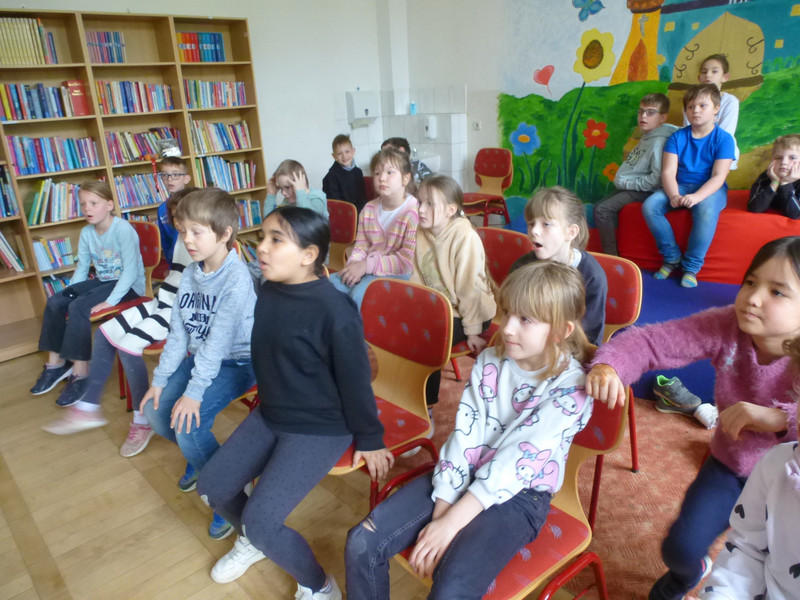 Diese coole Idee hatte Frau Kleinwächter von der Stadtbücherei Aue. Sie besuchte uns anlässlich des Welttages des Buches und hatte tolle Bücher im Gepäck.