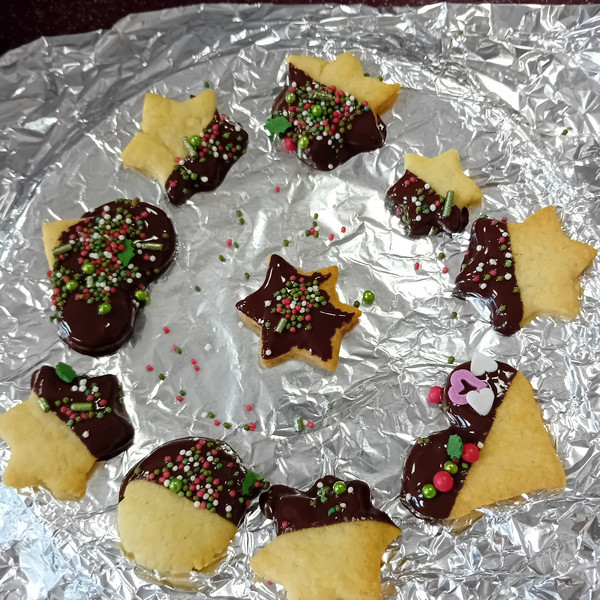 So wie im bekannten Lied, erging es unseren Kindern am Dienstag, dem 17. 12. 2024, in unserer Schulküche unter der Anleitung von Frau Skorzus. Gemeinsam wurde fleißig Teig ausgerollt und allerlei weihnachtliche Motive wurden ausgestochen. Nach dem Backen ging es an die wohl schönste Aufgabe: das Verzieren. Mit Schokolade und herrlich bunten Streuseln wurden die Plätzchen liebevoll verschönert. Dabei entstanden nicht nur richtige kleine Kunstwerke, sondern diese waren auch noch köstlich. Da waren sich am Ende alle Kinder einig - selbstgebackene Plätzchen schmecken einfach am besten!