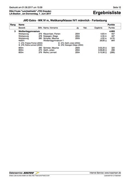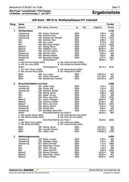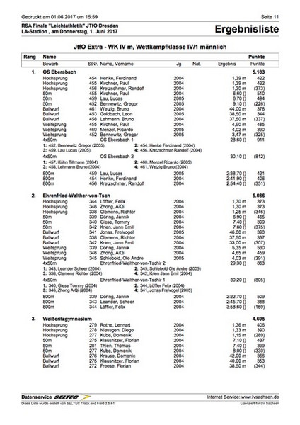 Bei bestem Sport-Wetter nahmen 9 Jungen unserer Schule am Regionalfinale Jugend trainiert für Olympia Leichtathletik teil. Sie hatten sich dafür bereits zu Beginn des Schuljahres im Stadtfinale als beste Jungenmannschaft der WK IV in der Stadt Dresden qualifiziert. Jannik, Emil, Tommy, Felix, Jonas, Ole S., AiQi, Clemens und Leander S. konnten im Ballwurf, Sprint, Hoch- & Weitsprung sowie im 800m- und Staffellauf viele Bestleistungen erzielen. Mit einer Nasenlänge Rückstand hinter der Oberschule Ebersbach landeten die Jungs des Tschirnhaus-Gymnasiums, an dessen Aussprache sich auch der Sprecher erst gewöhnen musste, auf dem Silberrang und sind damit 2. bestes Team im Bereich der SBA Regionalstelle Dresden. Ein klein wenig Wehmut schwingt jedoch mit, schließlich wäre man als Sieger in das Landesfinale aufgestiegen und hätte in Chemnitz um den Titel bestes Team ins Sachsen gekämpft. Nichtsdestotrotz bleibt neben den guten Leistungen auch der geschichtsträchtige Fakt, dass man die erste Mannschaft des noch jungen Tschirnhausgymnasiums war, die bei einem Schulsportwettkampf aufsteigen konnte.Ein Glückwunsch geht an alle Athleten und Unterstützer. Martin Schmidt