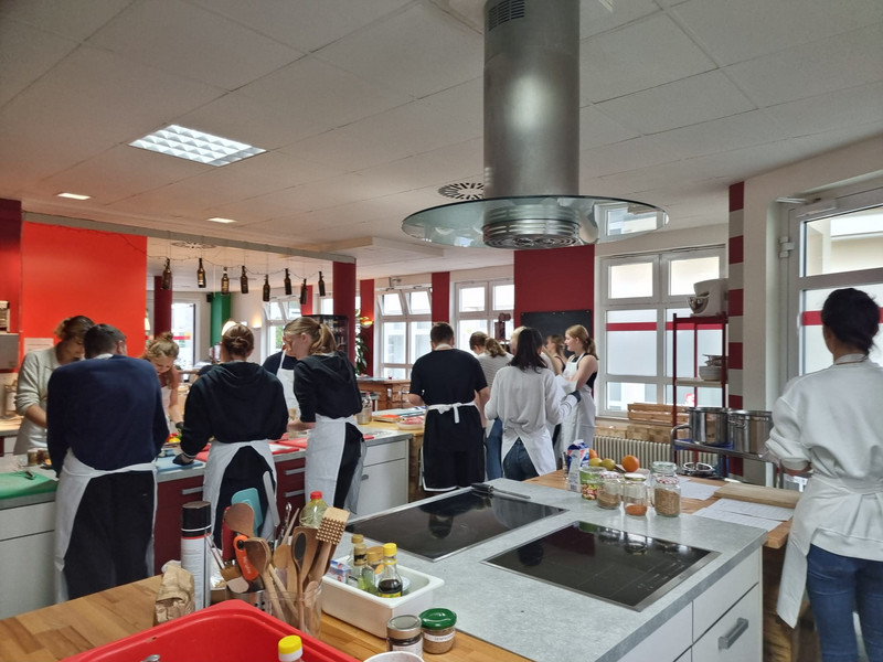 geplant. Jede Gruppe hatte ihr Gericht und wir hatten echt viel Spaß beim Kochen und Backen. Da wir aufgrund von Corona keinen Salsa Tanzkurs machen konnten, hatte Frau Bordihn uns nach dem Essen mit einen Salsa Crashkurs überrascht und durch unsere temperamentvolle Tanzlehrerin hat es gleich doppelt Spaß gemacht.