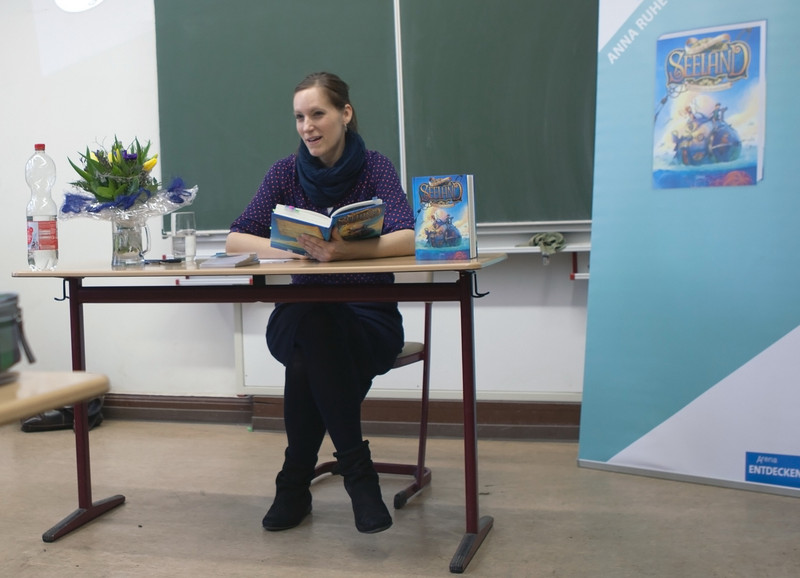 "Max hat einen Plan: Endlich raus aus dem öden Kaff Bittie Cross und seinen Vater suchen, der seit Jahren verschwunden ist. Dass sich die seltsame Emma an seine Fersen heftet und ihn zwingt, in einen Brunnen zu klettern, passt Max gar nicht. Doch plötzlich reißt ein Strudel die beiden mit sich – und sie landen in einer unglaublichen Welt: Seeland! Hier gibt es Städte auf Stegen und Häuser wie Eisberge, kauzige Pilzsammler, Unterwasserpiraten, freundliche Riesenquallen und echte Meerjungfrauen. Und ausgerechnet in Seeland entdeckt Max eine Spur seines Vaters. Wie kann das sein? Zusammen mit Emma taucht Max ab in das größte Abenteuer seines Lebens." Alle Schüler der 5/4 sind gespannt, wie die Geschichte weiter geht, denn die Lesung der Autorin Anna Ruhe in ihrer Klasse war viel zu schnell zu Ende. Und dabei hatte alle noch so viele Fragen an Frau Ruhe. Zum Glück gibt es in unserer Schulbibliothek jetzt ein Exemplar des Buches (sogar signiert), so dass alle Leseratten erfahren können, wie Max' Abenteuer endet. Wir danken sehr herzlich der Autorin Anna Ruhe, Frau Klug vom Arena-Verlag und Frau Zimmermann vom Förderverein und Elternrat dafür, dass sie uns diese tolle Veranstaltng ermöglicht haben.