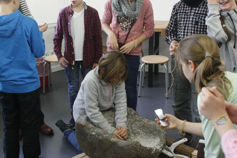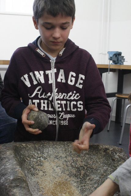 Das Staatliche Museum für Archäologie in Chemnitz war Ziel des Wandertages der fünften Klassen am 22.3. Die im Unterricht behandelte Ur- und Frühgeschichte konnte hier noch einmal hautnah erlebt werden. Interessant wurde es vor allem dadurch, dass die archäologischen Grabungsstätten und Fundstücke aus unserer unmittelbaren Region kamen - man sie also tatsächlich irgendwie kannte. Im Anschluss konnten die Schüler unter anderem noch erfahren, wie mühsam es früher war, das Korn für ein Brot zu mahlen – all das gemahlene Korn aller 4 Klassen zusammen dürfte wohl gerade so ein einziges (sehr kleines!) Brot ergeben!
