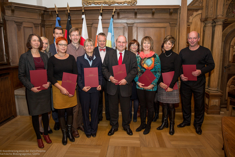 Nach der Eröffnung der Feierlichkeiten im Kleinen Saal des Rathauses Görlitz durch Oberbürgermeister Siegfried Deinege und die Leiterin des Koordinierungsbüros der Ziel3-Projekte Kinga Hartmann-Wóycicka betonte Thomas Rechentin, Leiter der Abteilung Grundsatzangelegenheiten des Bildungswesens, Internationales und Schulsport im Sächsischen Ministerium für Kultus, in Hinblick auf die Entwicklung des Freistaats Sachsen die Notwendigkeit, die Kenntnisse der Sprache und das Wissen um die Kultur des Nachbarn jenseits der Lausitzer Neiße bei sächsischen Lehrern/-innen und Schülern/-innen deutlich zu erweitern. In Zusammenarbeit mit ihren polnischen Partnern baue die Sächsische Bildungsagentur zu diesem Zwecke Schritt für Schritt nachhaltige Strukturen auf, indem sie mit ihren Projekten gezielt an den Stellen ansetze, die in Zukunft das Fundament der sächsisch-polnischen Bildungszusammenarbeit bilden werden, erklärte Béla Bélafi.