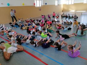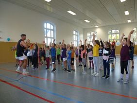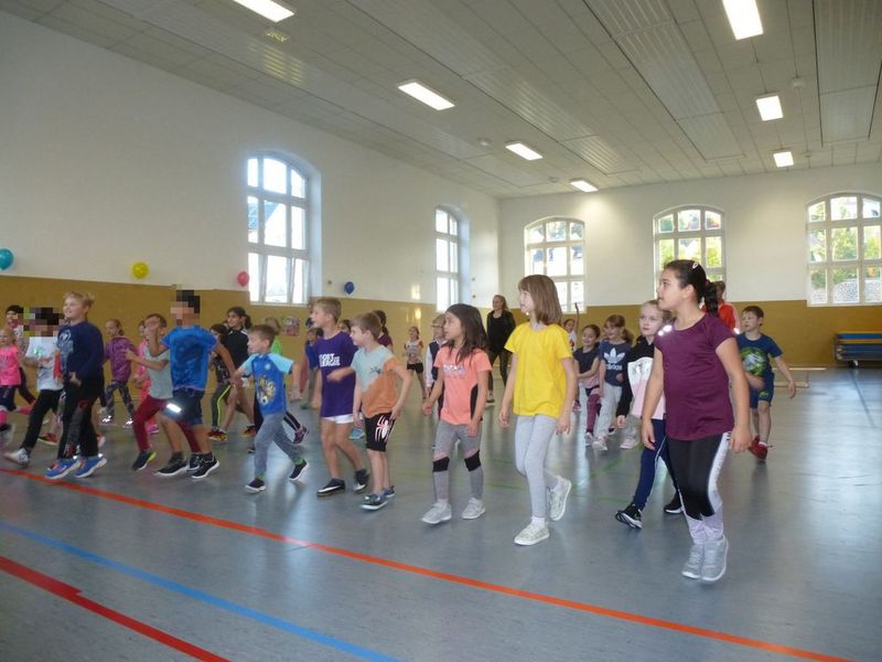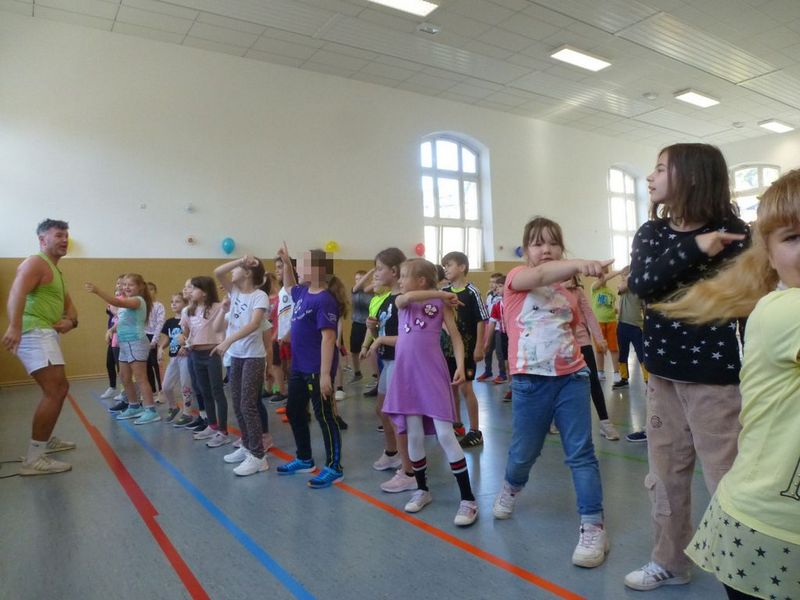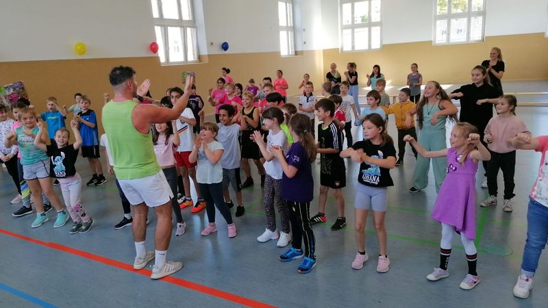 Ein ganz besonderer Tag erwartete unsere Schüler am 07. 10. 2022. Der Tanzlehrer Michael Hirschel war zu Besuch und verwandelte unsere Turnhalle in einen riesigen Tanz- und Partysaal. Mit seiner coolen Art und fetziger Musik lernte er den Kindern die einzelnen Tanzschritte und unter großer Begeisterung entstanden ganze Choreographien. Dabei waren wirklich alle regelrecht im Tanzfieber und tanzten fleißig mit. Zum Abschluss wurden die einstudierten Tänze den Zuschauern vorgeführt. Diese staunten, was die Kinder in so kurzer Zeit lernten und gemeinsam vortanzen konnten und so gab es zum Schluss tosenden Applaus.