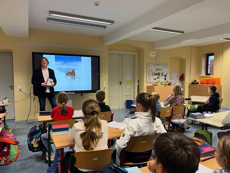 Zum internationalen Vorlesetag gingen alle Schülerinnen und Schüler unserer Grundschule auf Spurensuche ins Reich der Bücher und Schriftsteller. Die 1. Klassen beschäftigten sich vor allem mit den Märchen und besuchten unsere Märchenvorleserin Frau Haubold, die unseren Computerraum liebevoll märchenhaft gestaltet hatte. Sie lernten auch unsere Schulbibliothek kennen und nahmen mit Begeisterung ihre Leseausweise in Empfang. Die 2. Klassen wanderten durch den Wald nach Moritzburg und erkundeten die Stephanus- Buchhandlung. Große Freude bereitete allen Kindern die Vorstellung des Kinderbuches "Der kleine Raubdrache" durch die Buchhändlerin. Bei einem anschließenden Quiz konnten sie ihre Kenntnisse über im Unterricht gelesene Kinderbücher unter Beweis stellen. Die 3. Klassen fuhren mit den öffentlichen Verkehrsmitteln nach Dresden zur Zentralbibliothek im Kulturpalast Dresden. Sie erkundeten die verschiedenen Bereiche der Einrichtung und erfuhren, dass man außer Büchern auch Noten, Landkarten, Musikinstrumente und vieles mehr ausleihen kann.. Die 4. Klassen hatten den Kinderbuchautor Ralf Günther zu Gast im Klassenzimmer. Er sprach über seine Arbeit und beantwortete die neugierigen Fragen der Kinder. Außerdem las er aus seinem Buch "Eine Kiste voller Weihnachten" vor. Für alle war der Vorlesetag ein interessanter Tag zum Thema Literatur.