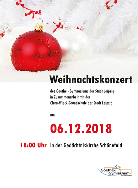 Wir möchten noch einmal herzlich alle Kinder, Eltern, Lehrerinnen, Lehrer und Freunde des Goethe-Gymnasiums zum Weihnachtskonzert am 6.12.2018 um 18 Uhr in der Gedächtniskirche Schönefeld einladen. Wir freuen uns über zahlreiche Besucherinnen und Besucher und wünschen allen eine schöne Vorweihnachtszeit