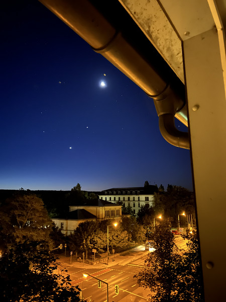 Wenn man mal Nachts nicht schlafen kann, lohnt sich ein Blick aus dem Fenster in die „Sterne”. Da kann man zur Zeit ein superschönes Schauspiel bewundern. Heute so ungefähr gegen 04:00 Uhr gaben sich die Venus, der Jupiter und ein Sichelmond ein Stelldichein am Himmel.