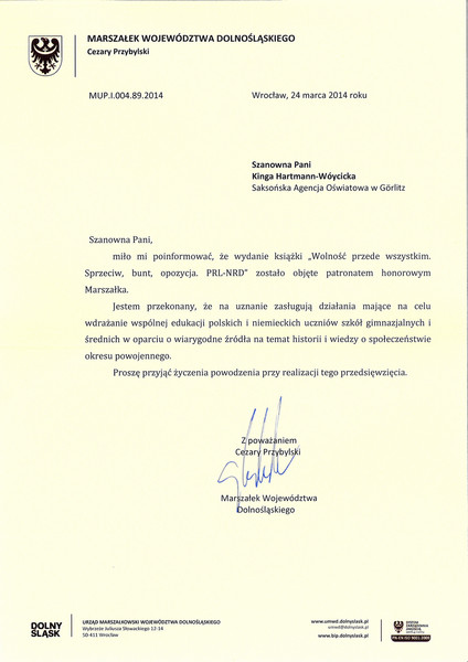 Marszałek województwa dolnośląskiego objął patronatem honorowym nową publikację Biura Koordynacyjnego "Wolność przede wszystkim. Sprzeciw, bunt, opozycja. PRL-NRD".