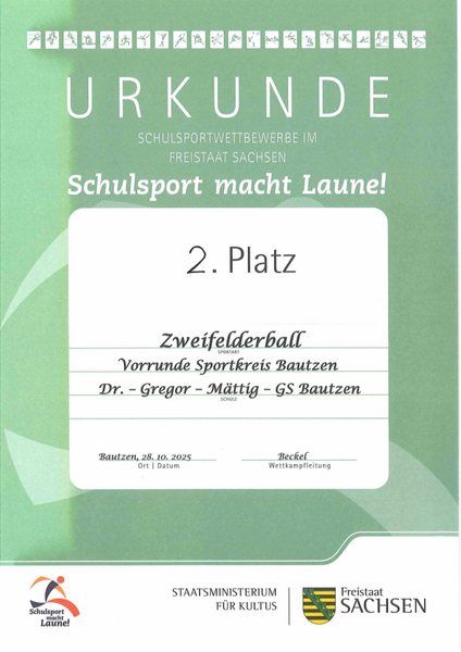 Fünf Schülerinnen und fünf Schüler der Dr.-Gregor-Mättig-Grundschule zeigten beim diesjährigen Kreisfinale im Zweifelderball eine tolle Leistung. Mit drei Siegen und zwei Unentschieden erkämpfte sich unsere Schulmannschaft ungeschlagen den zweiten Platz. Mit einem Sieg im letzten Spiel hätten sich die Mädchen und Jungen noch mit dem Gesamterfolg belohnt. Letztlich überwog nach kurzer Enttäuschung jedoch der Stolz über die starke Teamleistung im gesamten Turnier.