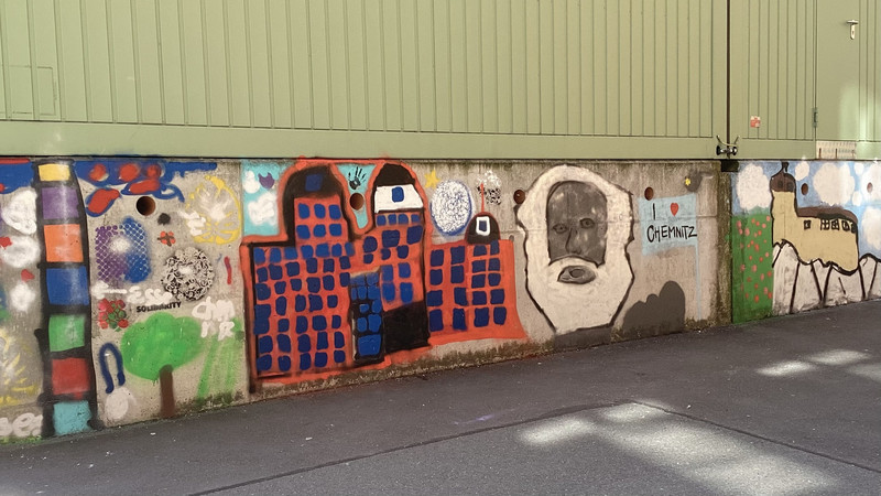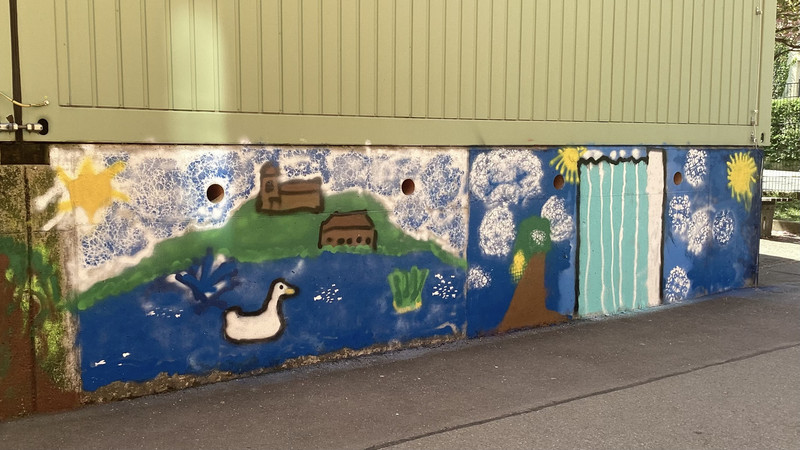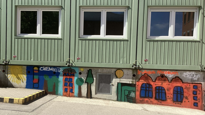 Am 02.05.25 haben die Kinder der Klasse 4 unseren Container im Rahmen eines Kunstprojektes mit Motiven zur Kulturhauptstadt Chemnitz 2025 verschönert.