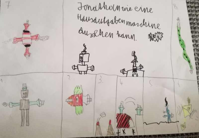 Während der Homeschooling-Zeit hat sich die Zauberin Flopsi gewünscht, dass ihr die Kinder helfen, Hausaufgabenmaschinen zu entwerfen.