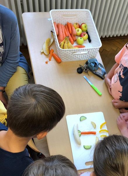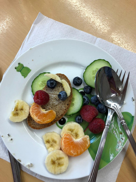 Zusammen bereiteten wir Kakao-Bananen-Milch (natürlich ohne Zucker) und Saftschorle zu. Besonders lustig waren unsere Schwarzbrotscheiben mit Frischkäse und lustigen Gesichtern aus Obst und Gemüse. Auch das Müsli mit Haferflocken, Banane, Apfel und Milch schmeckte uns gut. Nach dem gemeinsamen Frühstück wurde mit Hilfe der Ernährungspyramide noch einmal wiederholt, welche Lebensmittel gesund sind und wovon Kinder nicht so viel essen sollten. Wir haben an diesem Vormittag viel gelernt. Alle hatten ein leckeres und vor allem gesundes Frühstück im Bauch.