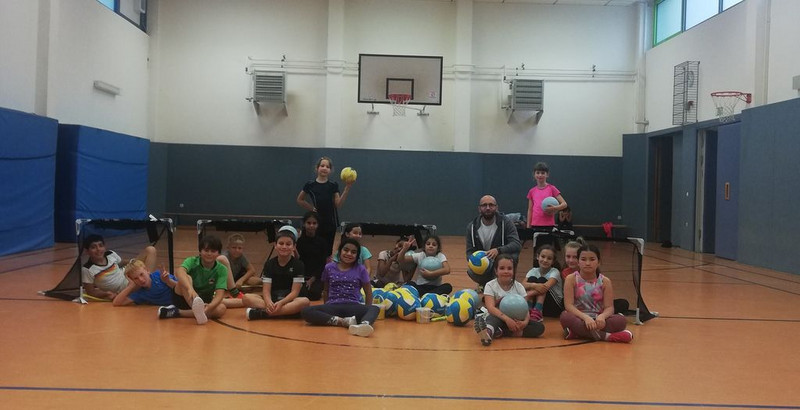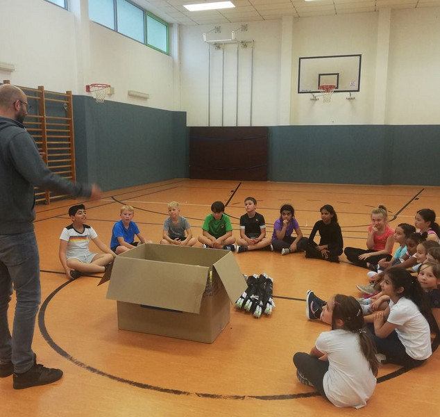Die Klasse 3a hat die überbrachten Sportgeräte im Namen aller Schülerinnen und Schüler dankend in Empfang genommen und schon einmal ausprobiert.