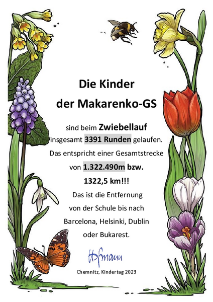 der gestrige Zwiebellauf war ein voller Erfolg. Insgesamt wurden von den Kindern 3391 Runden im Stadtteilpark gelaufen. Mit einer Rundenstrecke von je 390m ergibt sich eine Gesamtlaufstrecke von über 1300km - also von der Schule bis ans Schwarze Meer oder die Südspitze Italiens - phänomenal!