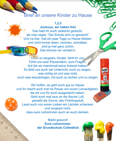 nun findet schon seit 3 Wochen kein Unterricht mehr statt. Wir hoffen, euch geht es gut und haben einen Brief für euch hinterlassen: