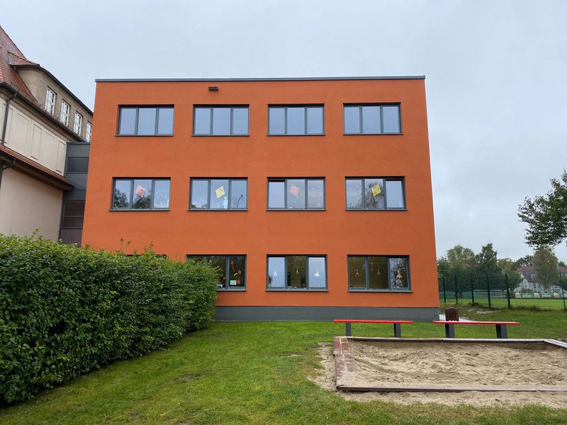 Ruhig und auf einer Anhöhe direkt hinter dem Park gelegen, präsentiert sich die Grundschule in strahlendem Orange. Der Neubau, welcher durch einen gläsernen Gang mit dem alten Oberschulgebäude verbunden ist, besteht aus acht Klassenzimmern sowie einem Werkraum. Da wir zur Zeit sechs Klassen beschulen, kann ein Klassenzimmer als Kunst- und Medienzimmer genutzt werden.