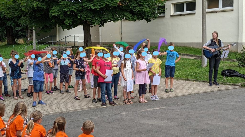 Die Klasse 2a und 2b haben dazu mehrere Lieder geübt, um sie den Viertklässler*innen darzubieten. Auch die Klasse 3a hatte ein Gedicht eingeübt. Die Viertklässler*innen selbst haben zu ihrem Abschluss auch etwas einstudiert. Die Klasse 4a sang mit instrumentaler Begleitung ein Lied und die 4b spielte einen Sketch vor.