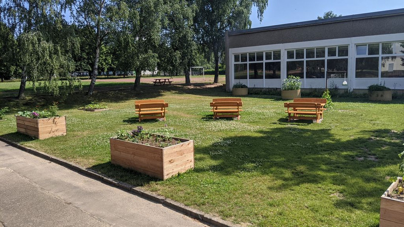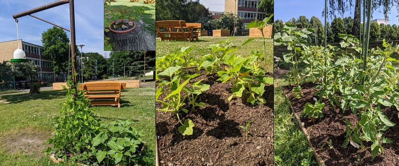 Auf dem Schulgelände wurde im Frühjahr 2021 der vorhandene Schulgarten erweitert und verschönert. Vorhanden waren vier runde Hochbeete und eine Blumenwiese für Insekten. Hinzugekommen sind nun drei weitere Hochbeete, drei „normale“ Beete, ein Kompost, Sitzmöglichkeiten sowie ein Wasserfass zum Gießen. Für die Vögel wurde eine Futterstelle sowie eine Trink- und Bademöglichkeit eingerichtet.