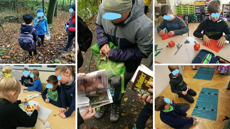 Die Klasse 1a und 1b unternahmen am Montag gemeinsam einen Wandertag in den Wald der „Roßweiner Siedlung“. Dort angekommen, suchten die Kinder nach unterschiedlichen Blättern und Früchten des Waldes. Die gesammelten Naturmaterialien wurden dann am nächsten Tag in der Schule genauer untersucht und sortiert. Künstlerisch setzten sich die Kinder mit dem Thema Herbstwald auseinander, indem sie ein Bild mit Naturmaterialien gelegt haben, was allen Freude bereitete. Mit den Tieren des Waldes setzten sich unsere Erstklässlerinnen und Erstklässler in einem Spiel auseinander: „Wer bin ich?“.