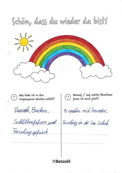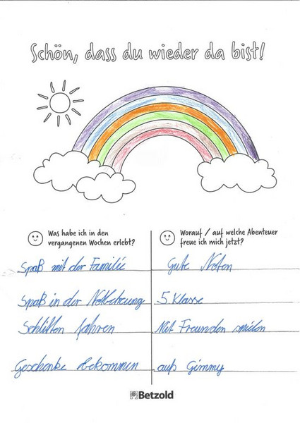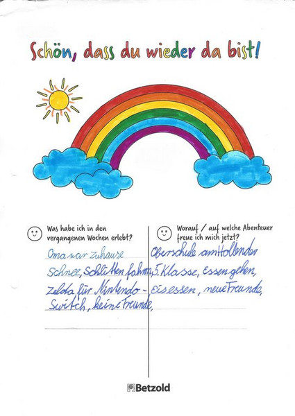 Am Montag wurden alle Schülerinnen und Schüler in einem Morgenkreis begrüßt. Auf einige Klassen wartete auf dem Platz auch eine kleine Überraschung. Im Morgenkreis tauschten wir uns über Erlebtes aus. Auch Probleme, Sorgen oder Fragen der Kinder wurden aufgegriffen. Dabei entstanden zum Beispiel in der Klasse 4a die Arbeitsblätter "Schön, dass du wieder da bist!".