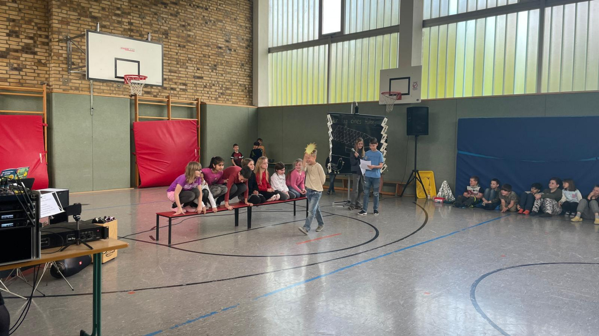 Für die Präsentation schlüpften wir in die Rolle von Hühnern und zeigten dem Publikum, wie der Tag eines Huhns ist.