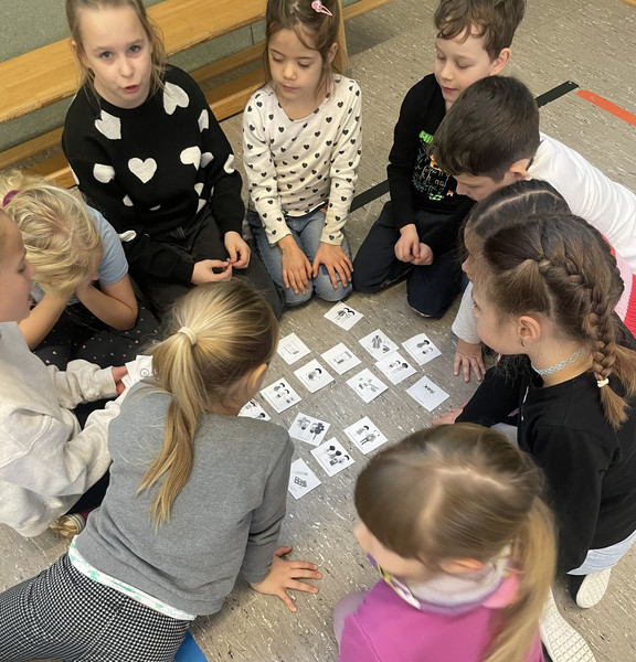 Die Klasse 1a arbeitete gemeinsam mit ihrer Patenklasse 4b an verschiedenen Aufgaben. Anhand eines Wimmelbildes kamen die Kinder ins Gespräch: Wo werden Kinderrechte beachtet? In Gruppen überlegten sie außerdem, was ihnen auf einer einsamen Insel besonders wichtig wäre. Schnell wurde deutlich, wie bedeutend Rechte wie Schutz, Familie und Nahrung sind.