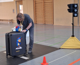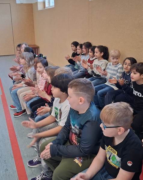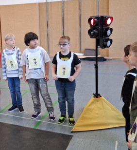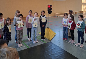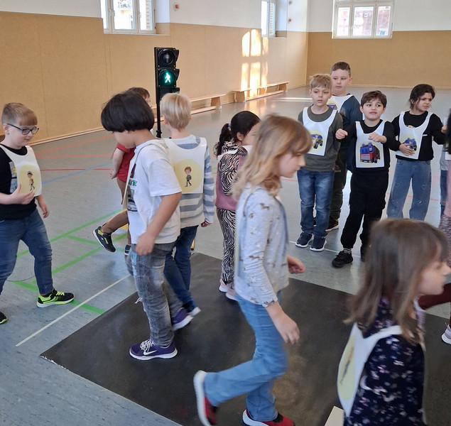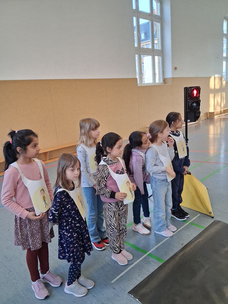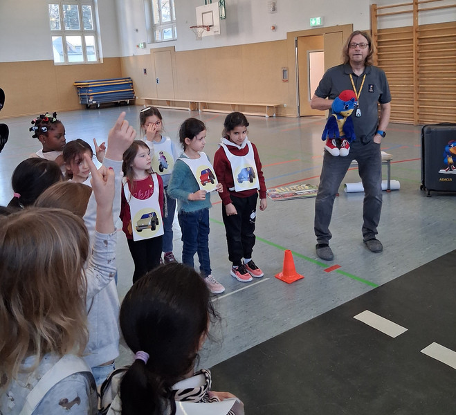 Am Freitag, dem 06. 03. 2026, staunten die Kinder der Klasse 1. In der Turnhalle warteten der kleine Rabe ADACUS und Herr Weiß vom ADAC auf sie und zeigte ihnen Alles zum richtigen Verhalten im Straßenverkehr. So lernten sie das sichere Überqueren der Straße, die Regeln an der Ampel oder am Zebrastreifen und was es beim Fahrradfahren und auf dem Schulweg zu beachten gibt. Dann durften die Kinder selbst in verschiedene Verkehrsteilnehmerrollen schlüpfen und an einer "echten" Ampel zeigen, was sie gelernt haben. Das klappte schon ganz gut, sodass sie alle von ADACUS noch eine tolle Urkunde erhielten. Nun sind die Erstklässler richtige Verkehrshelden und fit für den Straßenverkehr.