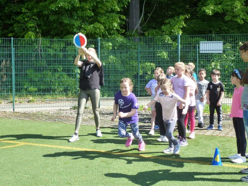 Nach der Erwärmung mit der Klasse 4 strengten sich alle beim Ausdauerlauf mächtig an. Anschließend kämpften alle beim 50m-Lauf, Ballweitwurf, Sockenzielwurf, Reifen- und Schlängellauf sowie beim Schlussdreisprung fair um gute Ergebnisse.