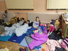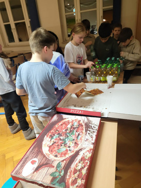 Am 21.11.25 ging unser großer Wunsch in Erfüllung. Wir durften abends wieder in die Schule kommen – zu unserer 2. Lesenacht. Mit Unterstützung unserer Eltern hatte schnell jeder sein „Bett“ für eine Nacht im Klassenzimmer aufgebaut. Mit leckerer Pizza stärkten wir uns für die kommende Nacht. Vorher lachten wir noch viel über die lustigen Abenteuer von „Paddington“. Nachdem der Film zu Ende war, wollten wir eigentlich Zähne putzen. Aber auf dem Gang fanden wir einen Brief vom Schulgespenst Düri, das wir gar nicht kennen. Wir mussten leise, langsam, ohne Taschenlampen durch das dunkle Schulhaus in die Aula kommen. Tapfer machten wir uns auf den Weg. In der Aula lag der nächste Hinweiszettel. Wir sollten den Spinnen folgen. Ihh! Aber wir schafften es. Die Spinnen führten uns zu einer Naschbox. Hurra! Das Ganze war aber ein Streich von unserem Wichtel Lasse!