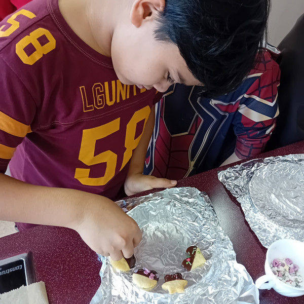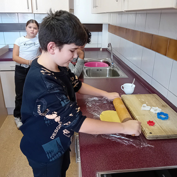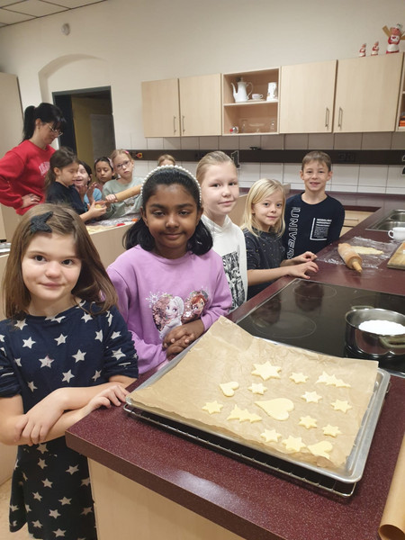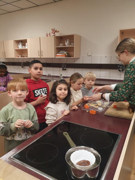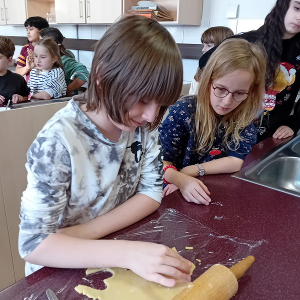 So wie im bekannten Lied, erging es unseren Kindern am Dienstag, dem 17. 12. 2024, in unserer Schulküche unter der Anleitung von Frau Skorzus. Gemeinsam wurde fleißig Teig ausgerollt und allerlei weihnachtliche Motive wurden ausgestochen. Nach dem Backen ging es an die wohl schönste Aufgabe: das Verzieren. Mit Schokolade und herrlich bunten Streuseln wurden die Plätzchen liebevoll verschönert. Dabei entstanden nicht nur richtige kleine Kunstwerke, sondern diese waren auch noch köstlich. Da waren sich am Ende alle Kinder einig - selbstgebackene Plätzchen schmecken einfach am besten!