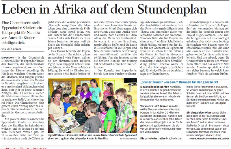 schon seit Mai 2010 unterstützen wir das Mayana-Projekt in Namibia, zu dem wir über die Chemnitzerin Ingrid Poike Kontakt halten.