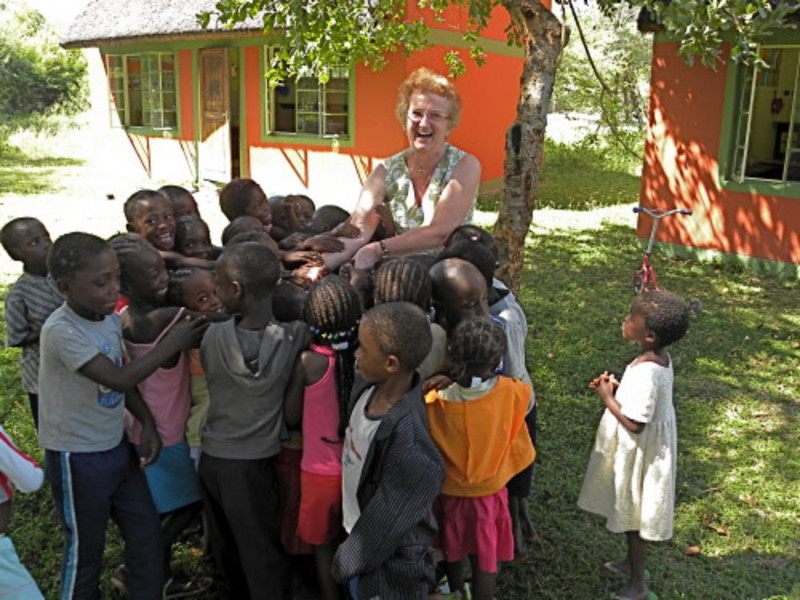 Ingrid Poike mit den Vorschulkindern vor den neuen Häuschen
