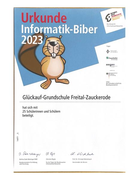 Die Glückauf-Grundschule Freital hat in diesem Schuljahr erstmalig am bundesweiten Wettbewerb Informatik-Biber teilgenommen. Für die Erst- und Zweitplatzierten Schüler gab es zur Belohnung kleine Preise. Neben der Teilnahmeurkunde erhielt unsere Schulgemeinschaft einen Plüschtier-Biber, der von den Schülern bereits den Spitznamen "Biber Schlaumeier" bekommen hat.