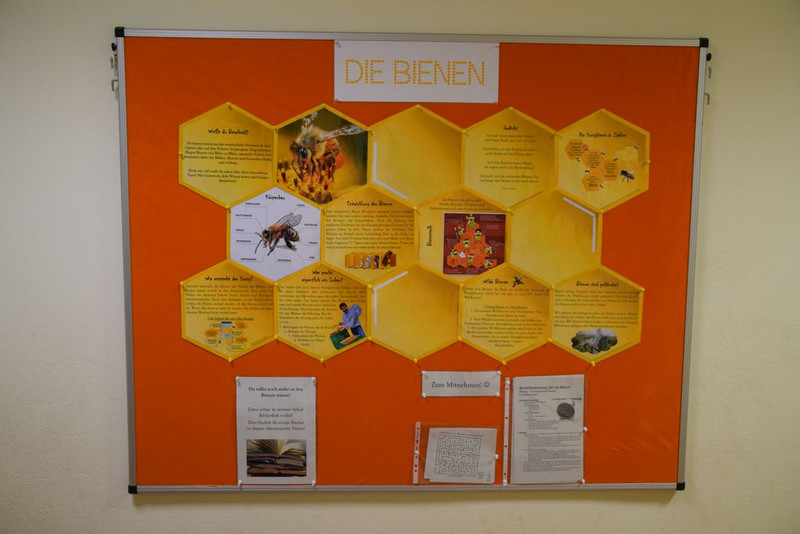 An den Pinnwänden im Schulgebäude werden Projektarbeiten präsentiert...