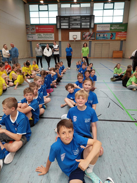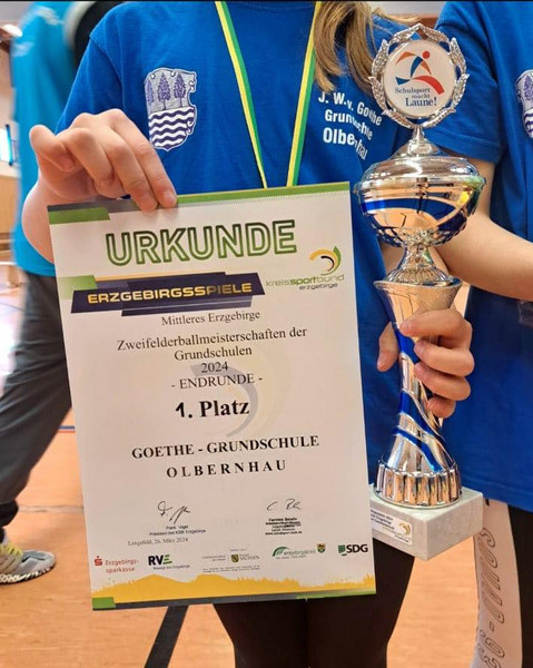 Am Mittwoch, dem 29. Mai 2024, fand das Erzgebirgsfinale im Zweifelderball in der Silberlandhalle in Annaberg statt. Neun Mannschaften spielten um den Titel des Erzgebirgsmeisters. Die Mädchen und Jungen der Goethe-Grundschule Olbernhau stellten in spannenden Spielen ihre Ballfertigkeiten unter Beweis und siegten am Ende vor den Grundschülern aus Auerhammer und Schneeberg. Nach den bereits souverän gewonnen Vorrunden war dies der krönende Abschluss und bestätigt die tolle Leistung und den Kampfgeist der Mädchen und Jungen.