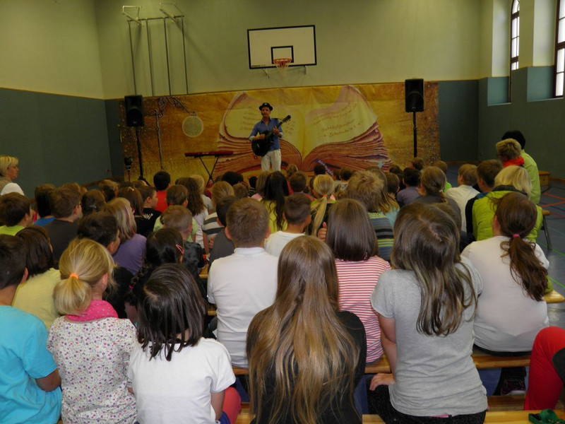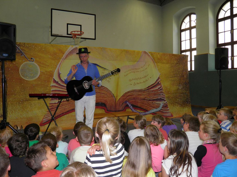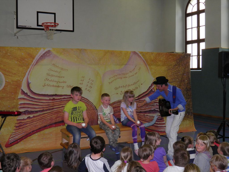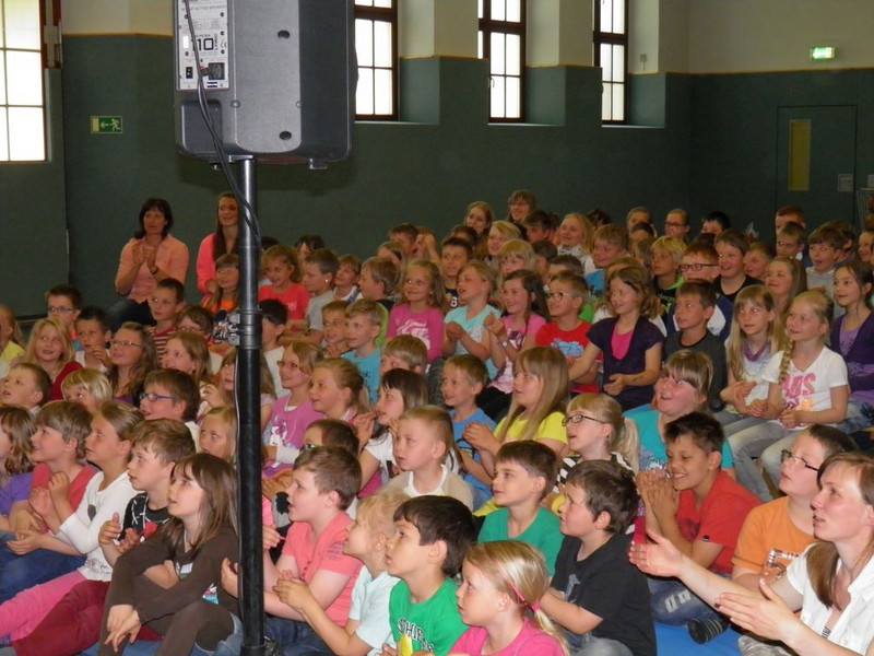 Im Vorfeld des Kindertages haben wir ein Liedkonzert mit Dirk Preuße erlebt. Es stand unter dem Thema „Mensch ärgere dich nicht“ und erweckte die Aufmerksamkeit unserer zukünftigen Schulanfänger bis hin zu den Viertklässlern gleichermaßen. Es ging um Höflichkeitsformen im Umgang miteinander. Zur Finanzierung nutzten wir neben einem geringen Eigenbeitrag der Eltern auch das Altpapiergeld auf dem Konto unseres Fördervereines. Fleißiges Weitersammeln hilft uns, solche oder ähnliche Höhepunkte finanziell zu unterstützen.