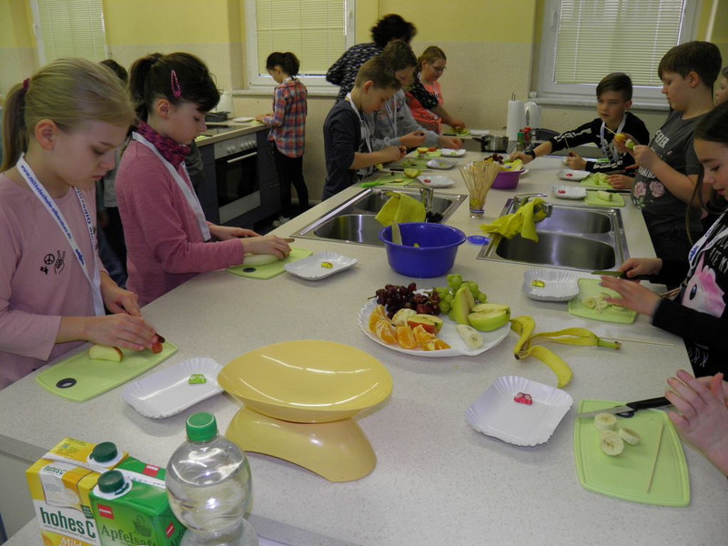 Am 30.11.2018 nutzten unsere vierten Klassen das Angebot zum Schnuppern in der Oberschule. Nach dem Eintreffen und der Aufteilung in Gruppen begann der Schulrundgang. Auf der Erkundungsrunde lernten wir die verschiedenen Fachkabinette kennen. Anschließend bereitete eine Klasse 4 im Hauswirtschaftskabinett leckere Obstspieße vor, um sie im Anschluss zu verspeisen. Die andere Klasse 4 beschäftigte sich mit japanischer Flechtkunst und jeder Schüler fertigte einen Schlüsselanhänger, den er mit nach Hause nehmen konnte. Danach wurden die Betätigungen getauscht. Im Anschluss stellte sich der Schulleiter, Herr Klaffenbach, den Fragen der Schüler. Ein Märchenquiz in der Aula beendete den Oberschulbesuch. Nun ging es zurück in die Grundschule, um die verbleibenden Stunden laut Plan in Angriff zu nehmen.