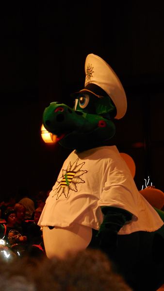 Eine vorgetragene Geschichte führte die Kinder durch ein buntes Programm mit Fernseh- und Kinderliedern. Es wurde viel gesungen und getanzt. Ein Lied durften die Schüler sogar selbst auf Instrumenten begleiten. Das Highlight stellte aber der Besuch vom Polizeidino Poldi dar, dem die Kinder die Hand schütteln und ihn streicheln durften.