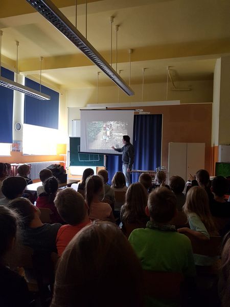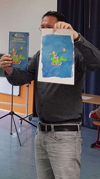Den Kindern der 1. und 2. Klasse stellte der Autor sein neues Buch "Mein Freund der Delfin" vor. Mit seinen Erzählungen und lustigen Zeichnungen begeisterte er die Schüler.