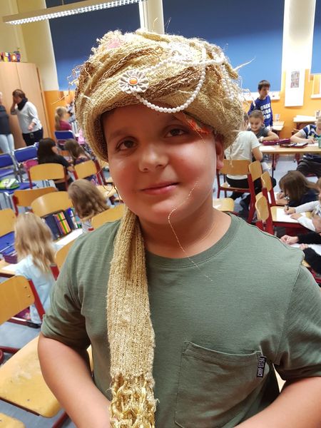 Für die Klassen 3 und 4 brachte er spannende Geschichten von seiner Indienreise mit. Die Schüler konnten die Episoden anhand einer Diashow mitverfolgen. Außerdem hatte TINO einen geheimnisvollen Koffer dabei, aus dem er einige Dinge seiner Reise hervorzauberte. Unter anderem einen indischen Turban, den verschiedene Schüler aufprobieren durften.