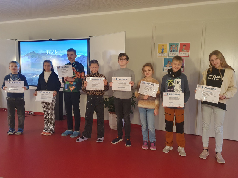 Die besten zwei Kinder, Luise aus der 4a sowie Liam aus der 4b, nehmen nun an der zweiten Stufe des Wettbewerbs, dem Landeswettbewerb in Dresden, teil. Dabei wünschen wir den beiden viel Erfolg!
