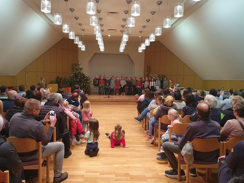 Aufgrund der steigenden SchülerInnenzahlen gab es dieses Jahr erstmalig zwei Aufführungen. Und die hatten es in sich, denn die Kinder haben den Weihnachtsbaum richtig gerockt! Die Grundschüler moderierten selbstständig ihr Programm, welches beide Male mit einem modernen Advent-Rap der zweiten Klassen begann. Die Zweitklässler waren dabei durch ihre Weihnachtsmützen und Sonnenbrillen an Coolness nicht zu übertreffen. Besonders die ganz Kleinen machten sich Sorgen um Weihnachten, denn der Weihnachtsmann ist vor dem Fest ganz schön dick geworden. So schickten sie ihn mit einem Gedicht, Lied und Tanzeinlagen wortwörtlich in die Mukki-Bude.