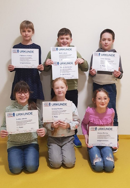 Alle Teilnehmer sowie Teilnehmerinnen können stolz auf ihr Ergebnis sein und haben gezeigt, dass sie sich wirklich gut mit dem Computer auskennen. Die zwei Besten unserer Grundschule, Matti und Lotta aus der 4a, dürfen nun nach Dresden zum Landeswettbewerb fahren, wo als Überraschung ein Kinobesuch im Filmtheater Schauburg ansteht. Wir sind schon gespannt, wie beide abschneiden und wünschen schon einmal viel Spaß sowie Erfolg.